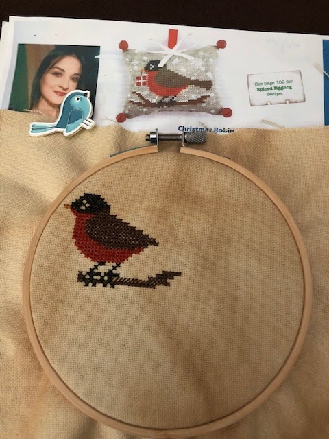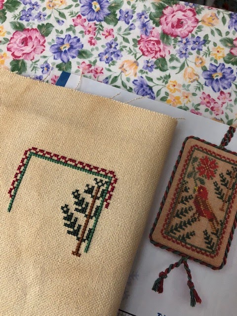 My third start, "In My Garden" by Black Bird Designs, stitched on 28 count Monaco and I used DMC floss. This is suppose to be a pin cushion, if you can see in the book cover photo. I'm a little scared to cut it up when I finish, might be easier to frame when I'm finished.